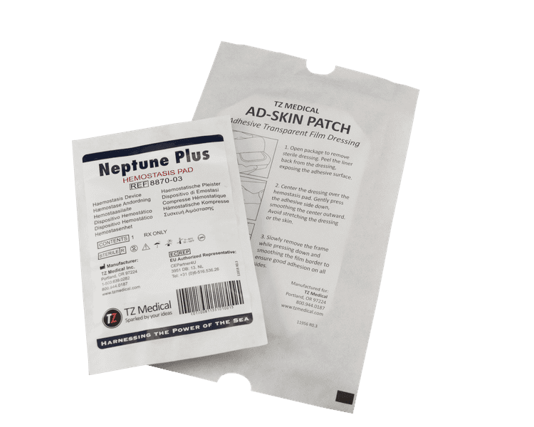 The TZ Medical Neptune Pad is a natural product derived from sustainably harvested seaweed that utilizes calcium ions to facilitate hemostasis. These ions are activated by introducing blood to the Neptune pad and help naturally speed up clot formation at the puncture site. Neptune has no known contraindications and may be safely used on all patients. The texture of the pad eliminates sliding, sliming, and sticking to gloves, and because the entire pad is the active ingredient, there is no "right-side-up."